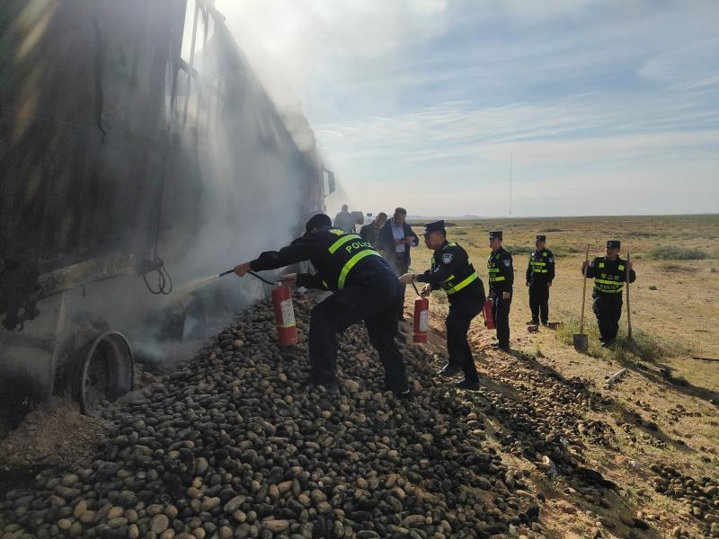 警情就是命令,民警們立即放下手中的工作,準備滅火救援設備,于第一時間趕往現(xiàn)場。到達后,民警們看到現(xiàn)場濃煙滾滾、火光四濺,一輛半掛車的尾部輪胎正在燃燒,同時現(xiàn)場還有其他車輛“冒險”經(jīng)過。隨后民警馬上分成3組投入戰(zhàn)斗。第一組2名民警立即封鎖道路,防止其他車輛進入火場;第二組3名民警攜帶滅火器對明火進行撲滅;第三組4名民警在明火撲滅后,隨即沙土掩埋的方式對著火部位進行覆蓋,防止死灰復燃。經(jīng)過2個小時的連續(xù)作戰(zhàn),火情得以有效控制。