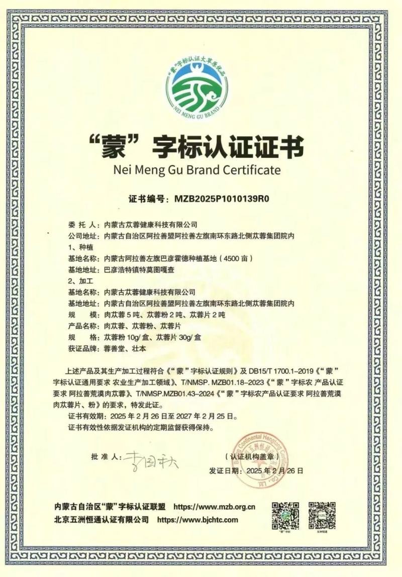 內(nèi)蒙古蓯蓉健康科技有限公司隸屬內(nèi)蒙古阿拉善蓯蓉集團(tuán)有限責(zé)任公司,主要負(fù)責(zé)肉蓯蓉種植基地建設(shè),以及肉蓯蓉食藥同源產(chǎn)品的生產(chǎn)與銷售。目前,公司已建成6萬畝高標(biāo)準(zhǔn)梭梭—肉蓯蓉高產(chǎn)穩(wěn)產(chǎn)示范基地,并獲評國家林下經(jīng)濟(jì)示范基地稱號。公司產(chǎn)品相繼通過有機(jī)產(chǎn)品認(rèn)證、中國森林認(rèn)證、生態(tài)原產(chǎn)地保護(hù)產(chǎn)品認(rèn)證、道地藥材認(rèn)證和7S道地保真管理體系認(rèn)證,全方位保障產(chǎn)品的生態(tài)有機(jī)特性與全程可追溯性。