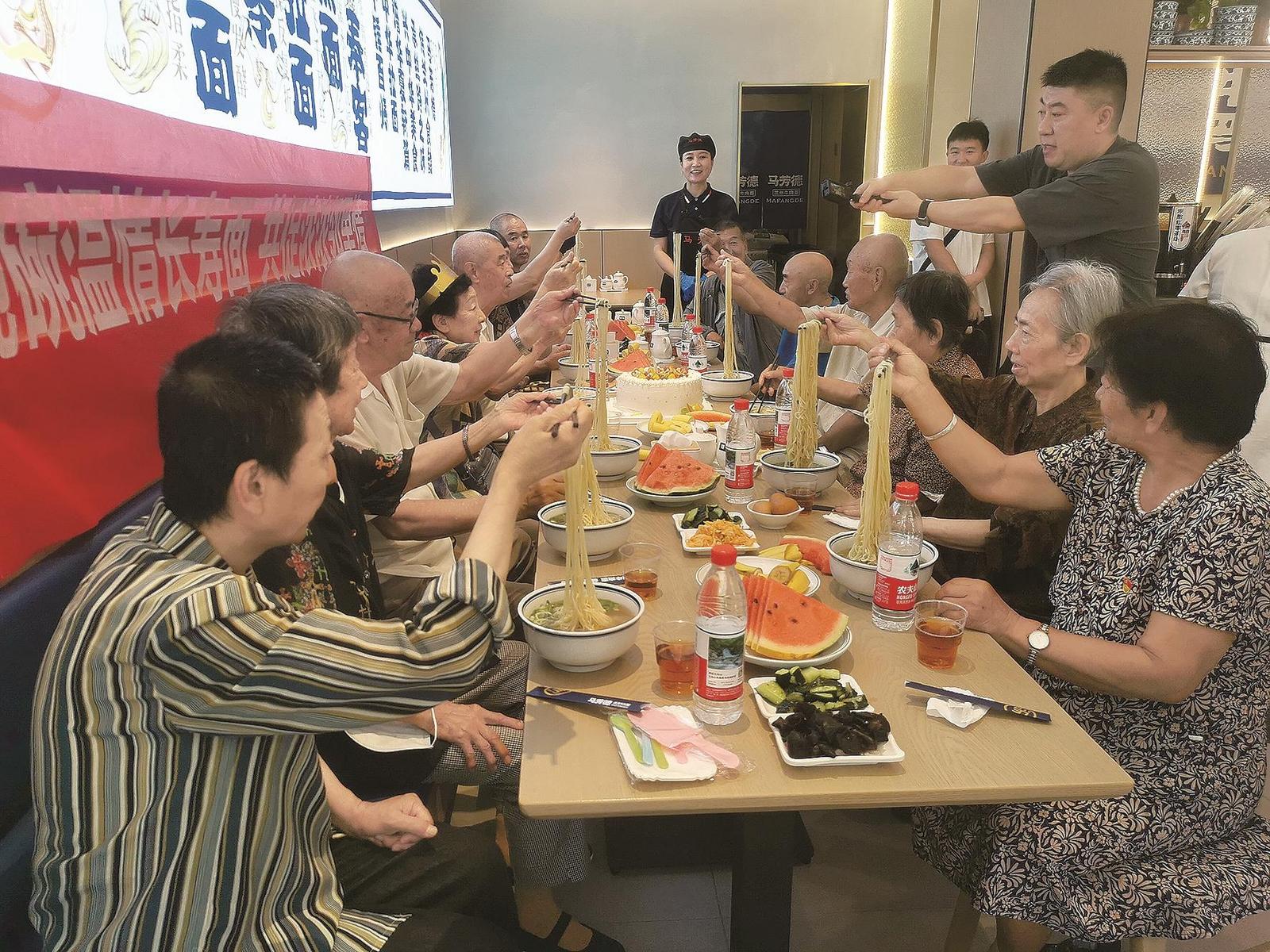 活動當(dāng)天,老黨員們圍坐在一起親切地嘮著家常。精致的水果擺盤和寫有“生日快樂”的生日蛋糕,寄托了社區(qū)黨委和轄區(qū)單位對老黨員們最真摯的祝福。老黨員們共同品嘗承載著祝福與情誼的長壽面,大家不分民族、不分彼此,共享美食,共話家常。( 杜森)