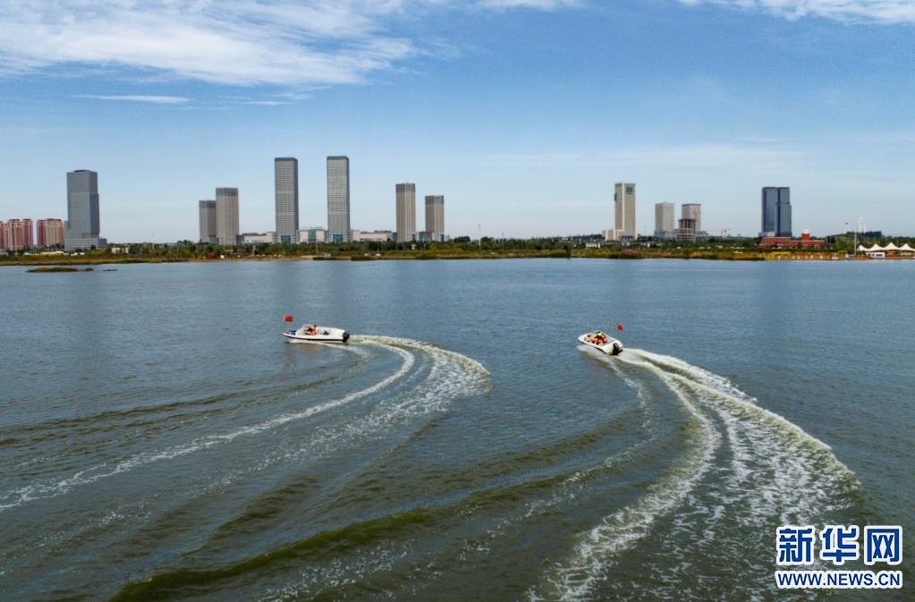 10月14日,游人在伊金霍洛旗東紅海子乘快艇游覽(無(wú)人機(jī)照片)。