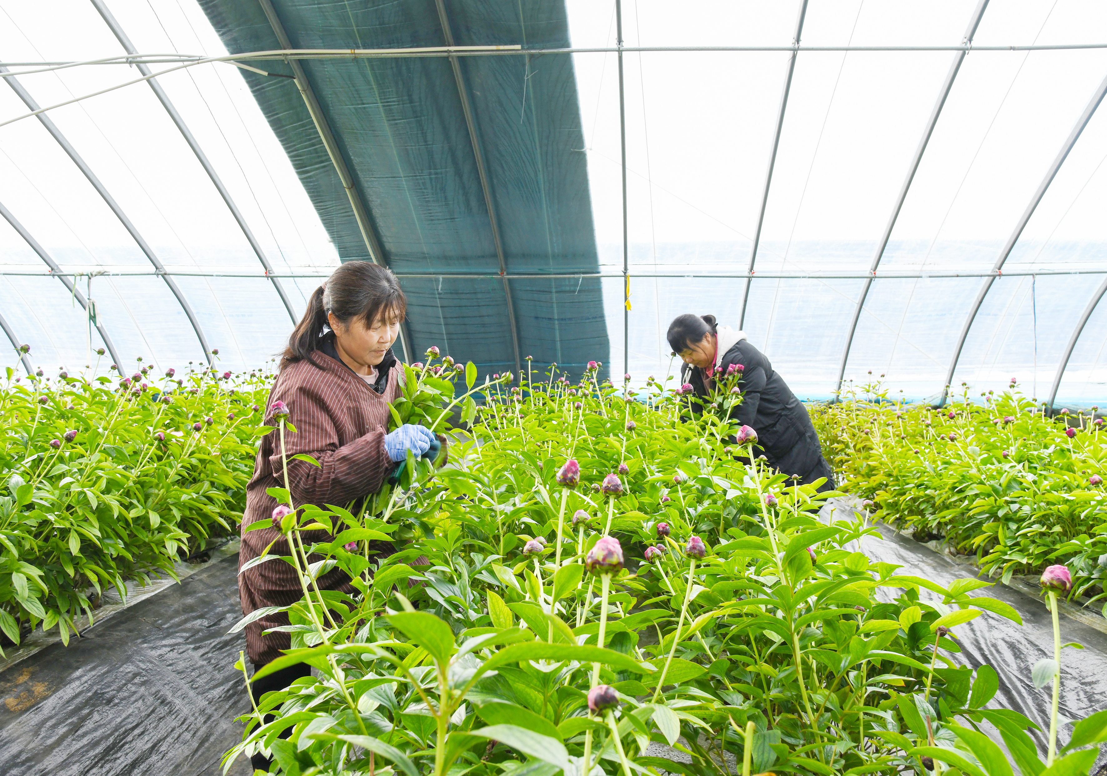 走進(jìn)大棚,一股溫暖濕潤的氣息撲面而來,映入眼簾的是郁郁蔥蔥、花朵艷麗的地栽芍藥,綠葉與花骨朵交相輝映,雖未綻放盛開,湊近時(shí)卻也嗅得到淡淡清香,儼然一幅綠意盎然的美麗畫卷。與此同時(shí),10余名鮮切花工人正忙著依照花朵長(zhǎng)勢(shì)和操作流程剪切著花枝并放入泡沫箱打包。隨后,包裝工人將打包好的泡沫箱運(yùn)往加工車間進(jìn)行預(yù)冷、清洗、分級(jí)、入庫等流程,最終等待快遞發(fā)貨。