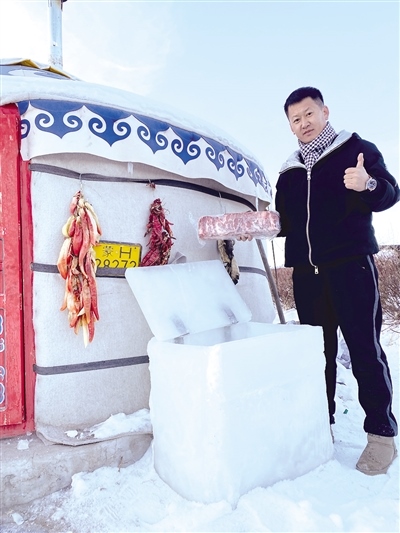 12月8日,記者幾經(jīng)周折與視頻中的小伙張智磊取得了聯(lián)系。張智磊今年36歲,從小在錫林郭勒大草原長大,在當?shù)刂饕雠Q蛉馍?。對于意外走紅,張智磊直言自己也沒有想到?!耙曨l是在錫林浩特市南郊向陽村叔叔家院子里的蒙古包拍攝的。記得小時候,每到冬天,周邊牧民都是把食物埋在雪地里儲存。我前幾天也拍了一個從雪地里找羊腿的視頻,有粉絲留言‘放在雪地里會不會忘記位置容易丟了’,然后我就突發(fā)奇想,干脆做個‘冰箱’把年貨放進去。”張智磊告訴記者,他從12月3日開始凍冰塊,12月4日把凍結實的冰塊拿出來用冷水黏合,因為冰塊低于0攝氏度,遇水就會瞬間黏在一起,然后開始著手打磨,棱棱角角都用電熨斗熨平整,再加上蓋,一個“冰箱”就完成了。