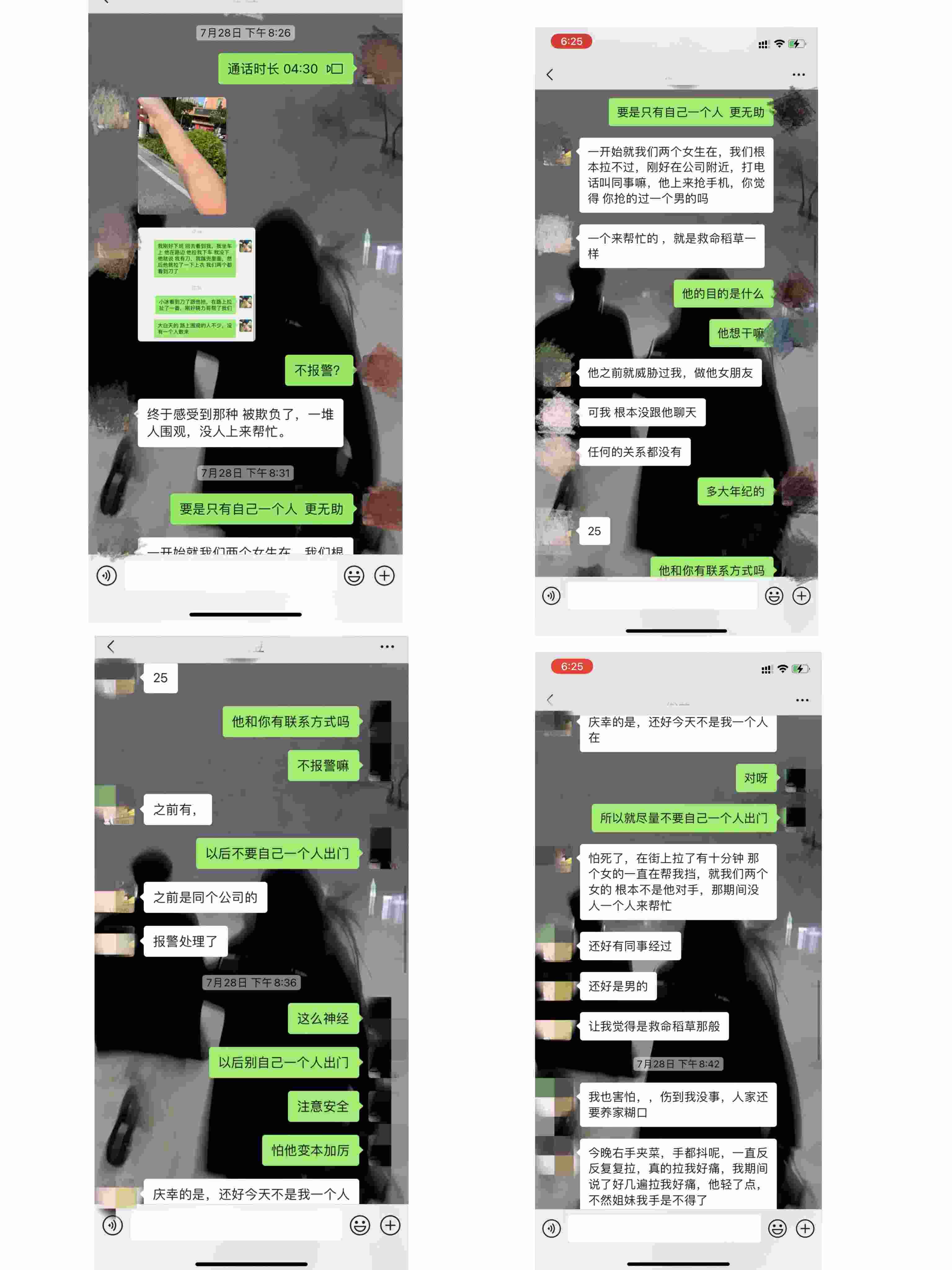 相關(guān)聊天截圖顯示,此次被黃某南威脅后,陳某萍和朋友在微信聊天時表示,“報警處理了”。陳某萍還表示,當(dāng)時,黃某南拉她上衣時,她看到了刀,感到非常害怕,幸好有同事出手相助。“他之前就威脅過我,做他女朋友??晌腋緵]跟他聊天,任何關(guān)系都沒有?!?/p>