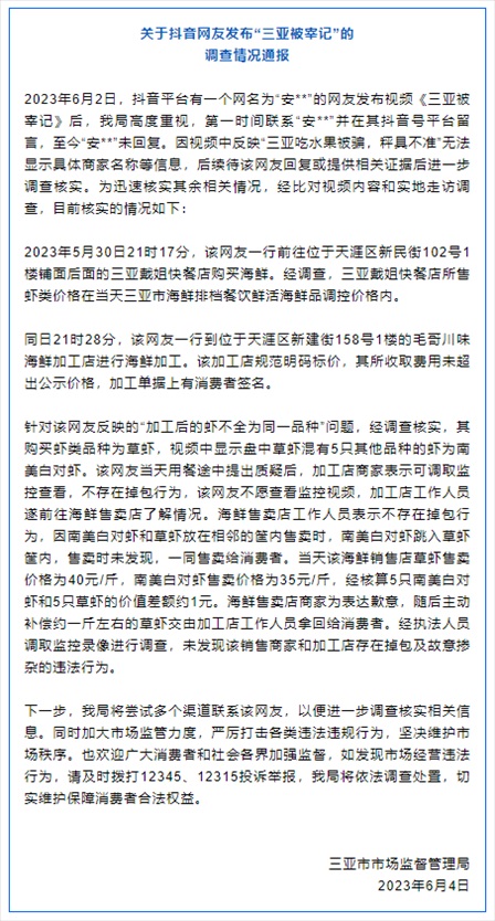 ·網(wǎng)友發(fā)布“三亞被宰記”,三亞通報(bào)調(diào)查情況。