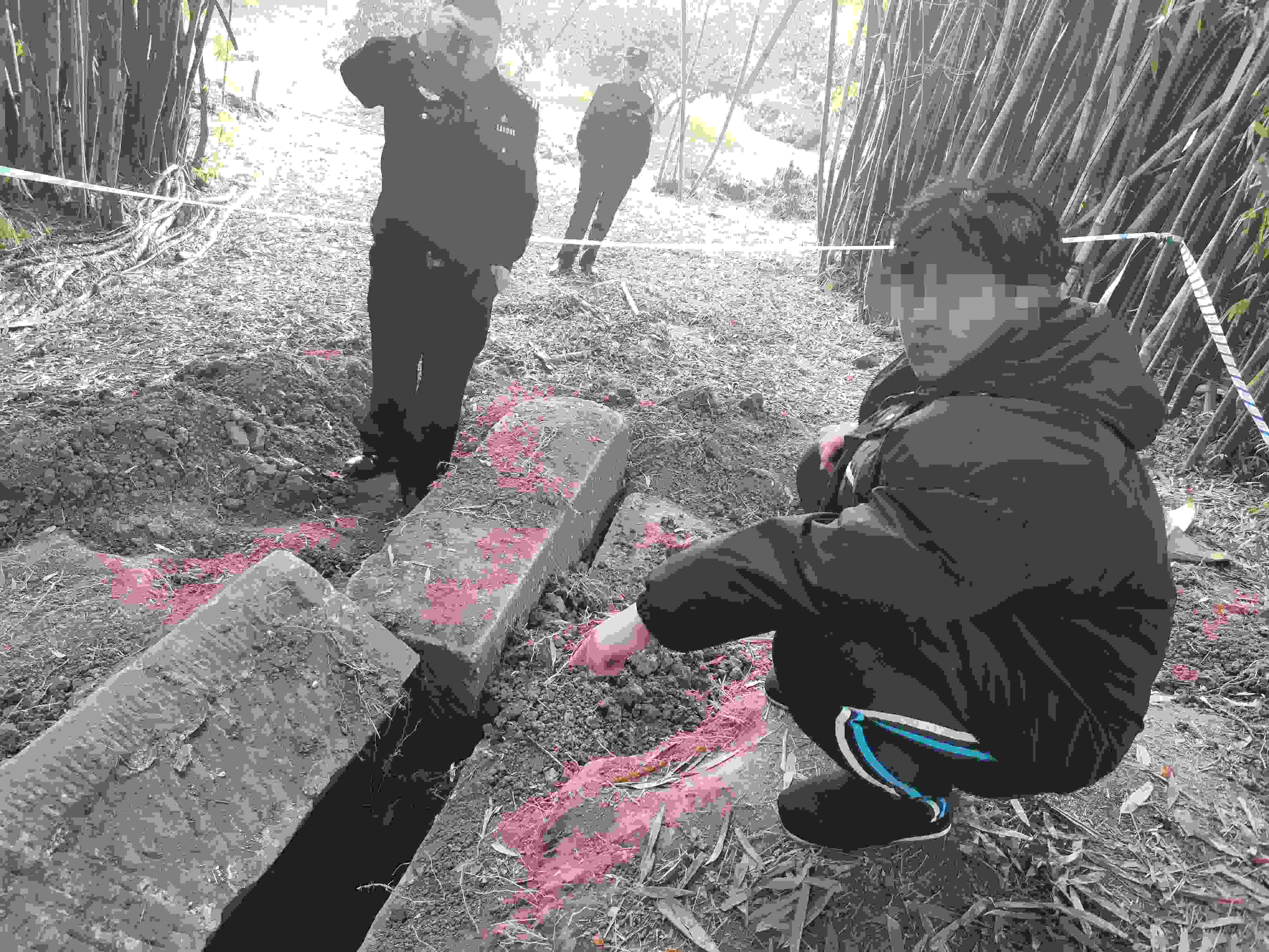 韓某家族的這座祖墳地處一片竹林中,離最近的房屋直線距離不足20米。為此,他趕到現(xiàn)場發(fā)現(xiàn),墓室上的土有多處被挖痕跡,但墓門上的石頭還沒被打開?!斑@個(gè)地方是條大路,白天也沒人看到有人來過?!表n某懷疑有人盯上了他家的祖墳,想要盜墓,并判斷那些人還會(huì)再來。