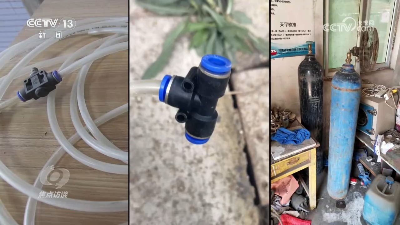 塑料軟管、三通管件、氮?dú)馄浚褪恰碍h(huán)??萍脊尽钡娜藖斫o磚廠安裝的所謂“環(huán)保設(shè)備”,他們把氮?dú)饨尤氩蓸庸芫€,稀釋采樣氣體,從而達(dá)到干擾在線監(jiān)測(cè)數(shù)據(jù)的目的。