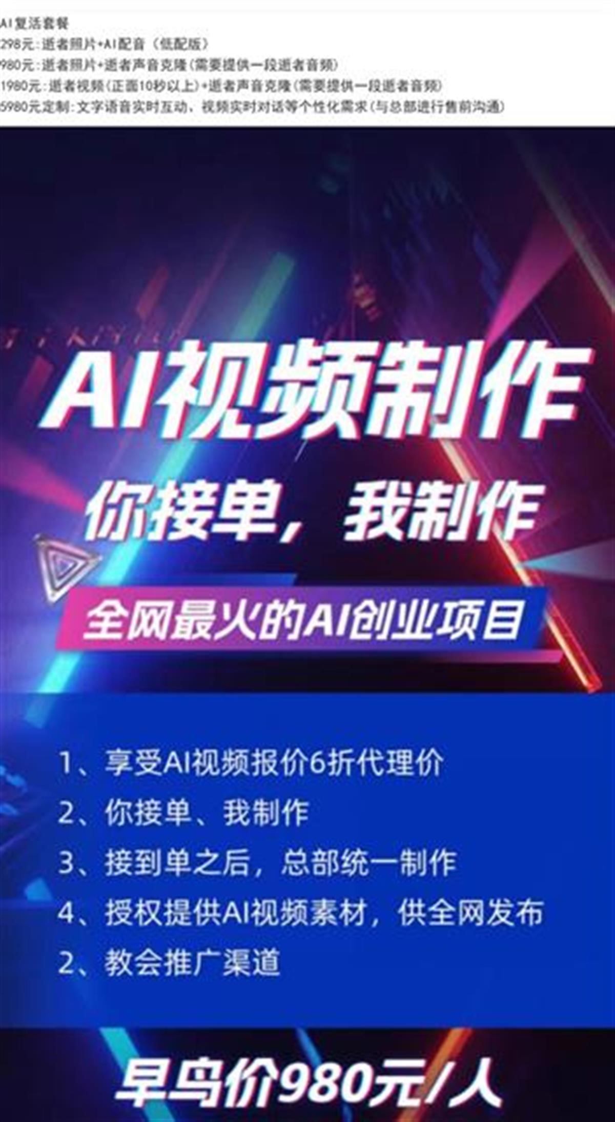 記者私信其中一名“AI復(fù)活師”詢問能否制作已逝明星的定制說話視頻,對方表示可以,且有多種模式可供選擇,需要添加微信了解詳情。對方提供的“AI復(fù)活套餐”包括“逝者照片+AI配音”“逝者照片+逝者聲音克隆”“逝者視頻+逝者聲音克隆”等服務(wù),價(jià)格從298元到1980元不等。除AI視頻服務(wù)外,這名“AI復(fù)活師”還表示正在收徒及尋找下游代理,可提供AI視頻制作教學(xué)服務(wù)。