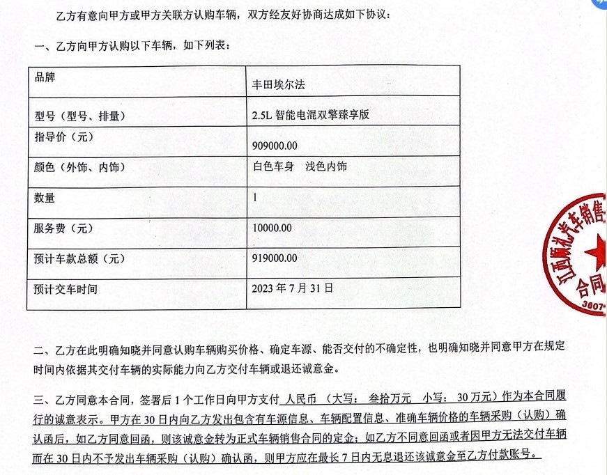 豐田埃爾法汽車,預(yù)計(jì)車款總額91.9萬元,其中車輛指導(dǎo)價(jià)90.9萬元,服務(wù)費(fèi)1萬元,預(yù)計(jì)交車時(shí)間為2023年7月31日。簽訂認(rèn)購合同當(dāng)天,任先生支付了30萬元誠意金。