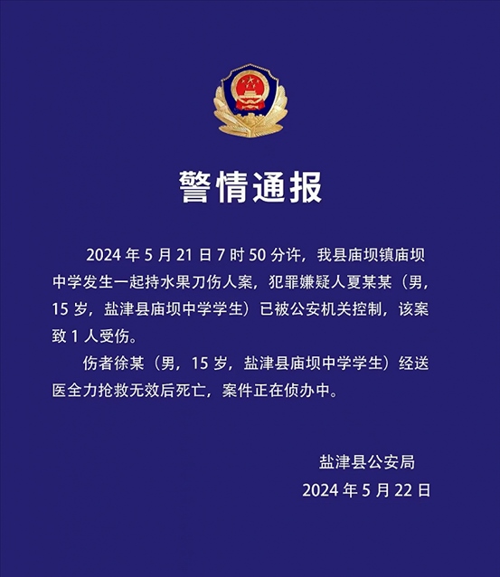央視網消息:云南鹽津縣公安局通報,5月21日7時50分許,鹽津縣廟壩鎮(zhèn)廟壩中學發(fā)生一起持水果刀傷人案,犯罪嫌疑人夏某某(男,15歲,鹽津縣廟壩中學學生)已被公安機關控制,該案致1人受傷。傷者徐某(男,15歲,鹽津縣廟壩中學學生)經送醫(yī)全力搶救無效后死亡,案件正在偵辦中。