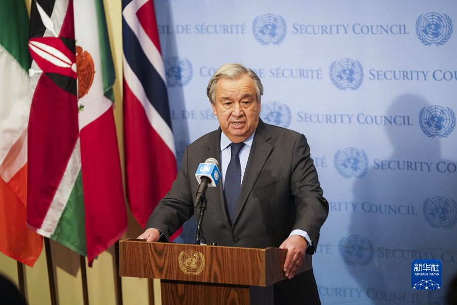 2月23日,在紐約聯(lián)合國總部,聯(lián)合國秘書長古特雷斯在安理會(huì)審議烏克蘭問題緊急會(huì)議結(jié)束后講話。 新華社記者 王迎 攝