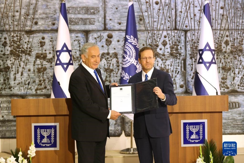 11月13日,以色列前總理內(nèi)塔尼亞胡(左)在以色列總統(tǒng)府接受總統(tǒng)赫爾佐格(右)頒發(fā)的組建新政府授權(quán)書。新華社記者王卓倫攝