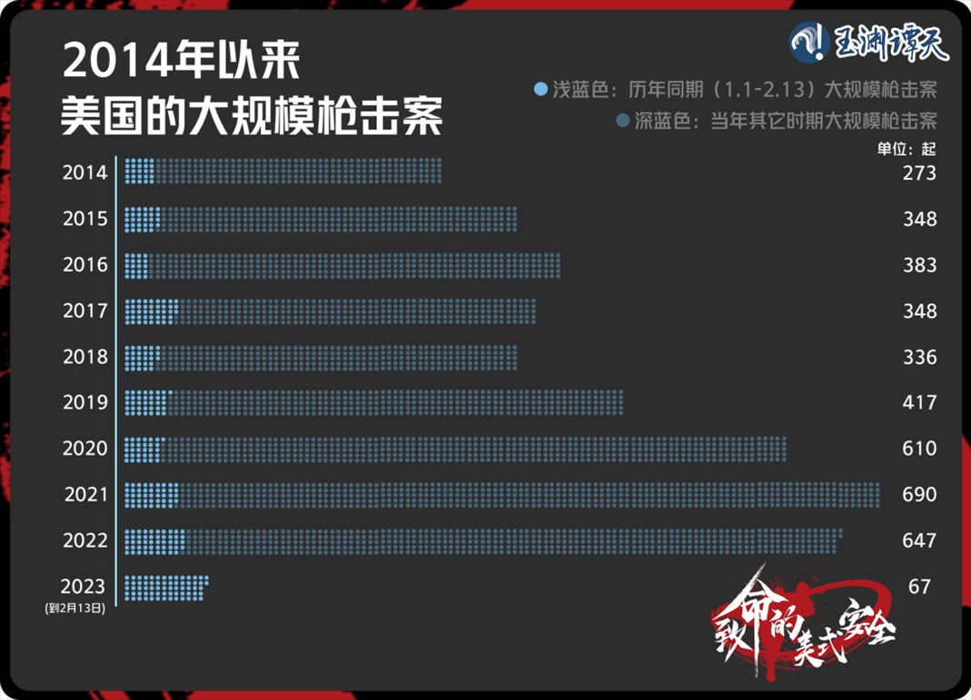 2023年開年到現(xiàn)在,美國的大規(guī)模槍擊案數(shù)量創(chuàng)下歷史同期新高。到2月13日,美國已經(jīng)發(fā)生了67起大型槍擊案,也就是說,現(xiàn)在的美國,平均每天至少要發(fā)生一起大規(guī)模槍擊案。在此期間,F(xiàn)BI飽受詬病,甚至被稱為美國槍擊案的間接推手。