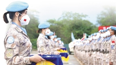 2022年9月30日,中國第八批赴南蘇丹(朱巴)維和步兵營700名維和官兵被聯(lián)合國授予“和平榮譽勛章”,以表彰他們在執(zhí)行維和任務(wù)期間的卓越表現(xiàn)和為南蘇丹和平事業(yè)作出的突出貢獻(xiàn)。圖為授勛儀式現(xiàn)場。 孫雪松攝(新華社發(fā))