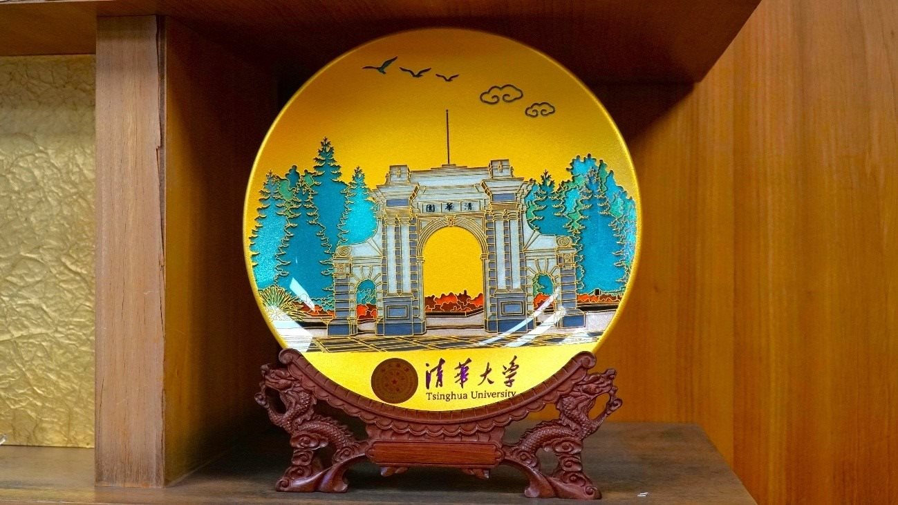 擺放在會議室的清華大學紀念盤。人民網(wǎng)視頻截圖
