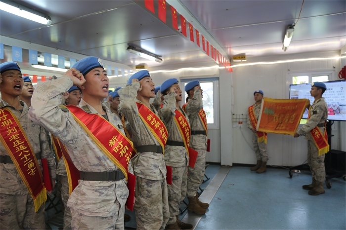 在嘹亮的宣誓聲中,全體官兵重溫了入連誓詞。維和任務(wù)區(qū)官兵再次領(lǐng)命,趕赴維和任務(wù)一線。