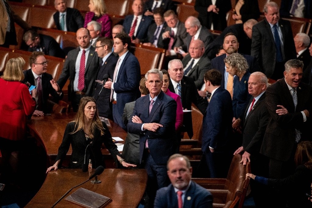 這是1月6日在美國華盛頓國會拍攝的凱文·麥卡錫(中)。經過黨內激烈爭論達成利益交換,共和黨眾議員凱文·麥卡錫于7日凌晨在第15輪眾議院議長選舉表決中當選議長。(新華社記者劉杰攝)
