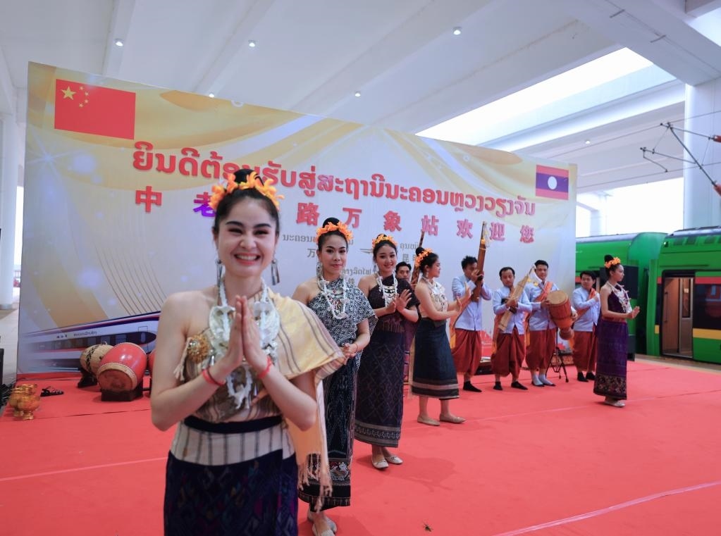 4月13日,在中老鐵路老撾萬(wàn)象站,工作人員歡迎乘坐D887次國(guó)際旅客列車(chē)的旅客。新華社記者 邢廣利 攝
