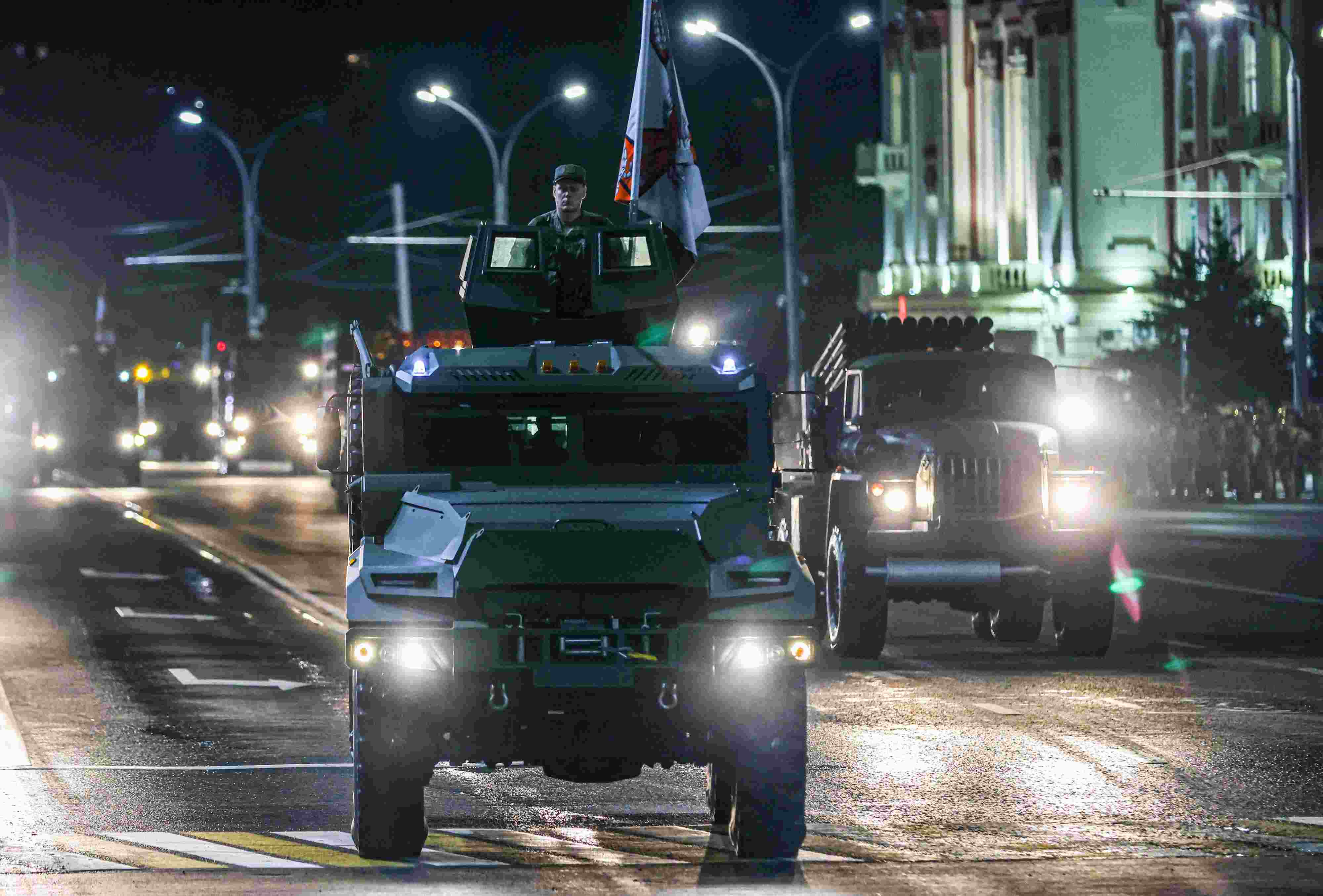 當?shù)貢r間2023年5月2日,俄羅斯頓河畔羅斯托夫,士兵們參加勝利日閱兵彩排。 視覺中國