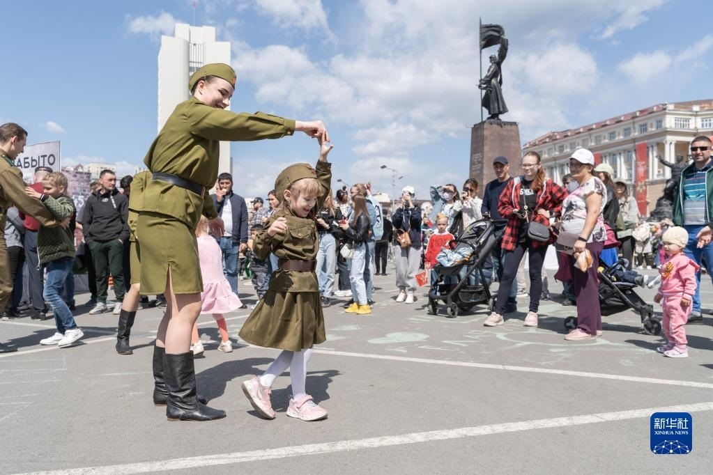 5月9日,在俄羅斯符拉迪沃斯托克,身穿模仿二戰(zhàn)時(shí)期蘇軍軍服的市民在廣場上跳舞。   新華社發(fā)(郭飛洲攝)