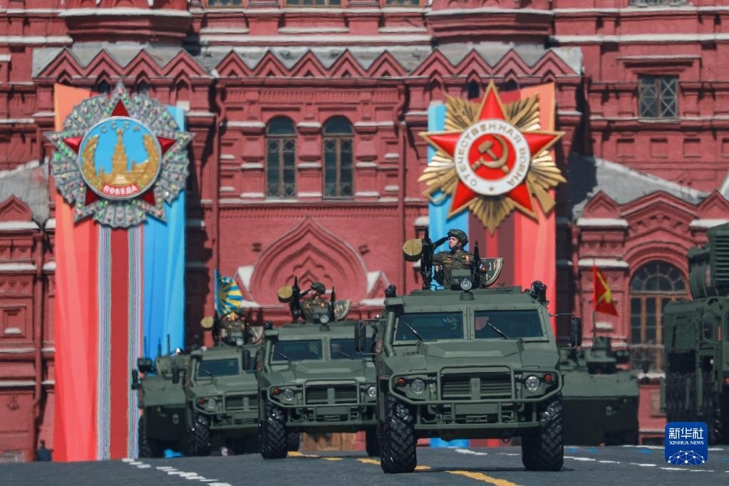 5月9日,在俄羅斯首都莫斯科,軍車編隊(duì)駛過紅場。   新華社記者 曹陽 攝