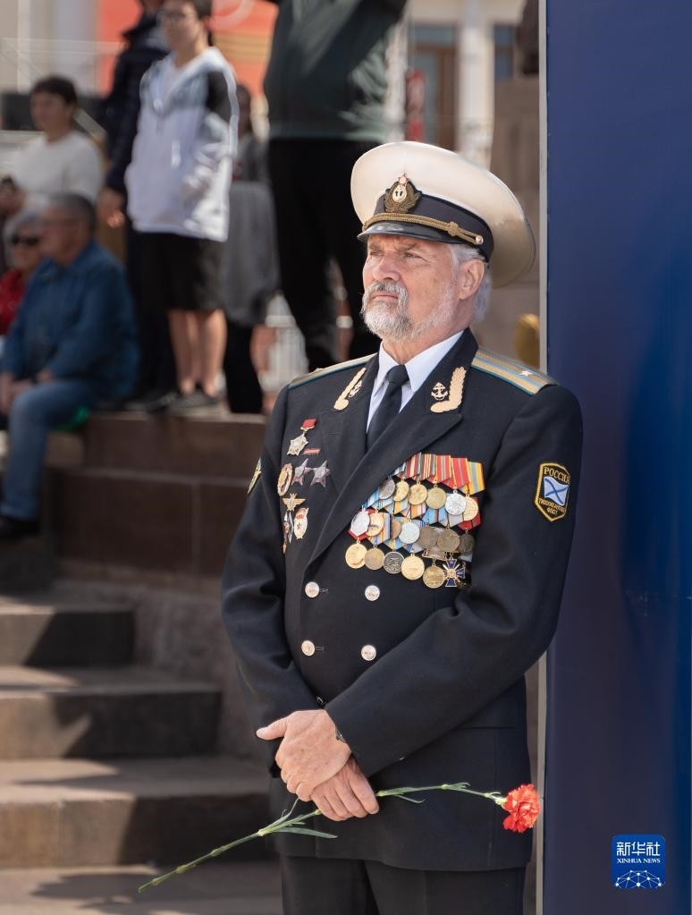 5月9日,在俄羅斯符拉迪沃斯托克,一位老兵參加勝利日慶?;顒?。   新華社發(fā)(郭飛洲攝)