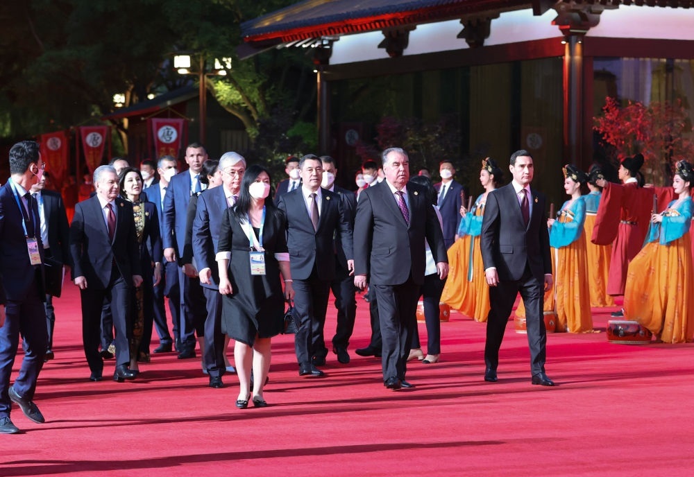 哈薩克斯坦總統(tǒng)托卡耶夫、吉爾吉斯斯坦總統(tǒng)扎帕羅夫和夫人扎帕羅娃、塔吉克斯坦總統(tǒng)拉赫蒙、土庫曼斯坦總統(tǒng)別爾德穆哈梅多夫、烏茲別克斯坦總統(tǒng)米爾濟(jì)約耶夫和夫人米爾濟(jì)約耶娃抵達(dá)紫云樓前。