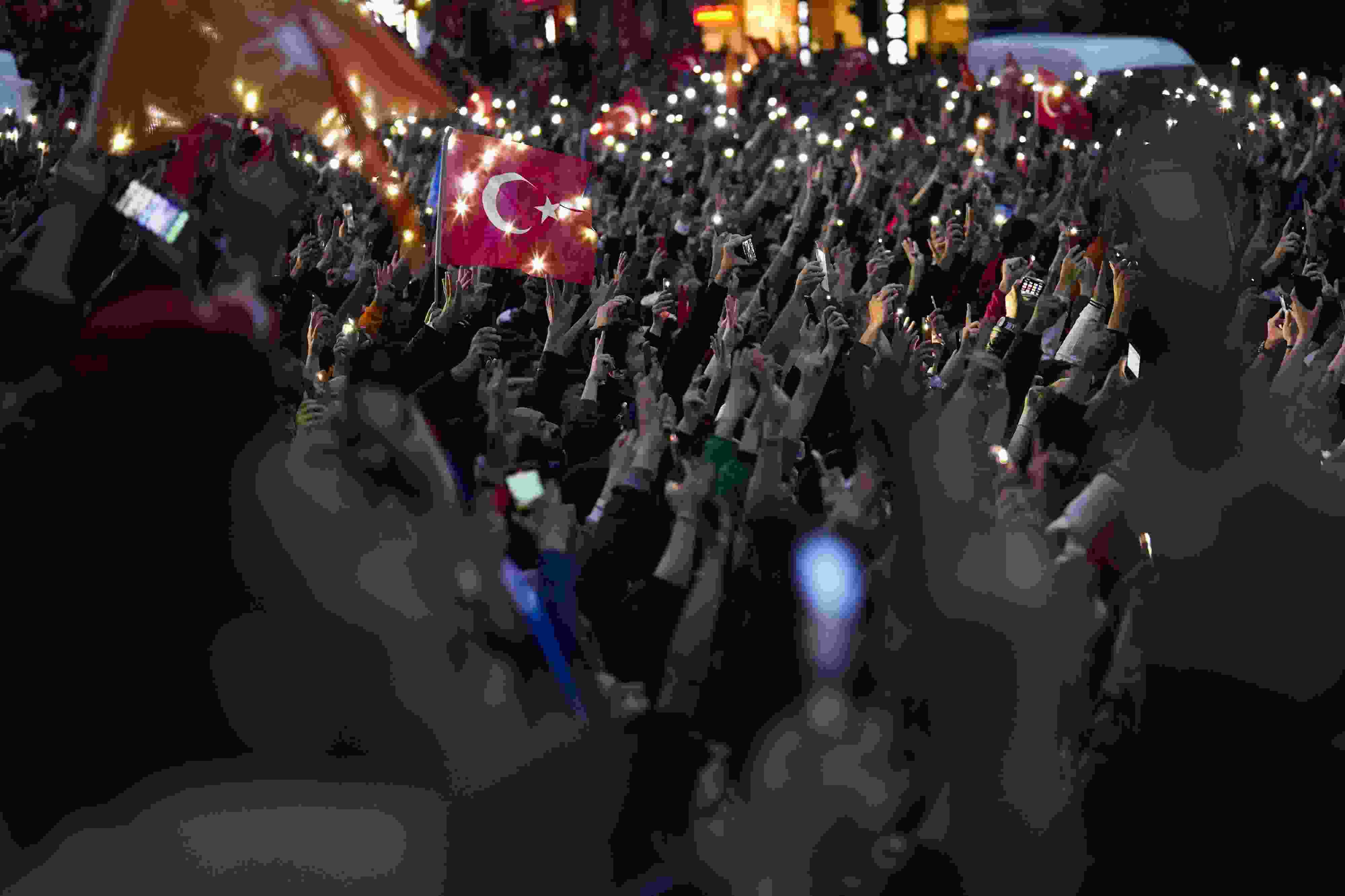 當(dāng)?shù)貢r(shí)間2023年5月28日,土耳其伊斯坦布爾,埃爾多安的支持者慶祝其再次當(dāng)選土耳其總統(tǒng)。土耳其最高選舉委員會(huì)主席艾哈邁德·耶內(nèi)爾28日深夜在首都安卡拉宣布,根據(jù)初步計(jì)票結(jié)果,現(xiàn)任總統(tǒng)埃爾多安在28日舉行的總統(tǒng)選舉第二輪投票中戰(zhàn)勝對(duì)手,再次當(dāng)選總統(tǒng)。 視覺中國(guó)