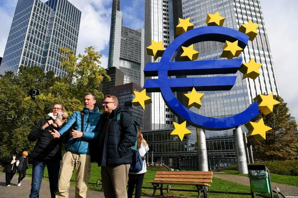 2021年10月13日,人們?cè)诘聡ㄌm克福歐元雕塑前自拍留影。新華社記者 逯陽 攝