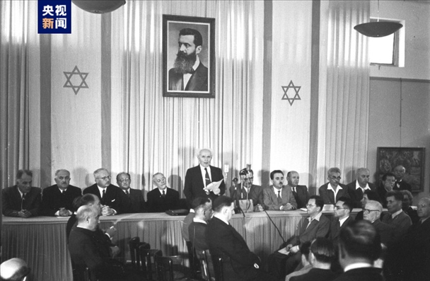△1948年5月,以色列首任總理本·古里安宣讀以色列《獨(dú)立宣言》。