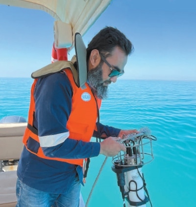 在中國港灣工程有限公司承建的沙特阿拉伯紅海開發(fā)項目中,工作人員使用水質(zhì)檢測浮標傳感器對施工區(qū)域內(nèi)水質(zhì)進行監(jiān)測。唐浩偉攝