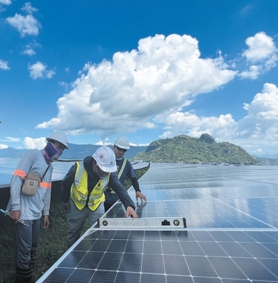 菲律賓圣馬塞利諾光伏項目由中國電力建設(shè)集團(tuán)有限公司承建,項目建成后將成為該國最大的光伏電站,每年將為菲律賓供電5.9億千瓦時。圖為中方工程師(中)帶領(lǐng)菲方工作人員檢查調(diào)試光伏支架。楊獲然攝