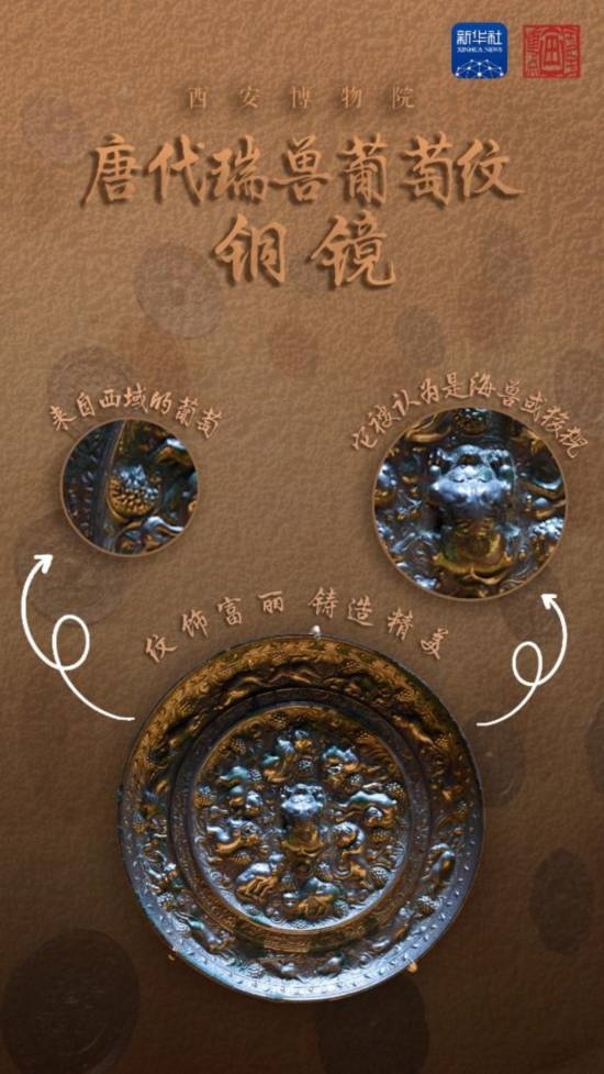 在唐代,我國銅鏡制作和使用進入繁盛時期,許多通過絲綢之路傳來的紋樣被工匠應用在銅鏡上。瑞獸葡萄紋銅鏡紋飾富麗、鑄造精美,備受當時民眾的青睞。瑞獸葡萄紋銅鏡將裝飾藝術和現(xiàn)實生活緊密結合,瑞獸象征著敏捷與美好,葡萄則象征著豐收充裕和多子多福,呈現(xiàn)出濃郁的盛唐氣象,是我國古代中西方文化交流的代表性產物。