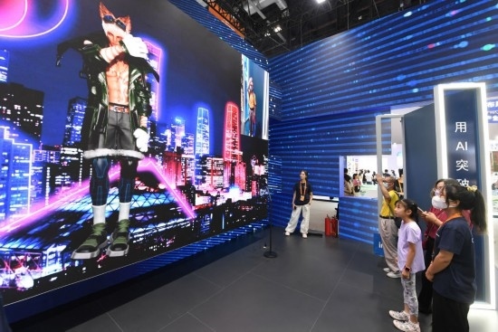 9月3日,一名參觀者在首鋼園中國移動展臺體驗基于AR/VR特效的敦煌導(dǎo)覽,沉浸式感受敦煌壁畫的魅力。新華社記者 李鑫 攝