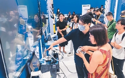 在畢馬威展區(qū),觀眾使用目鏡和手柄進(jìn)行元宇宙創(chuàng)作體驗(yàn)。