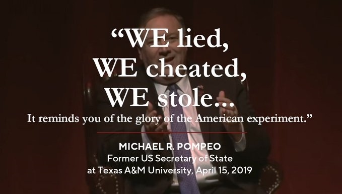 華春瑩在發(fā)布前述文字后陸續(xù)發(fā)布圖片,第一張圖片上的文字內(nèi)容便是關(guān)于美國(guó)前國(guó)務(wù)卿蓬佩奧2019年一場(chǎng)講話時(shí)的著名“交底”: