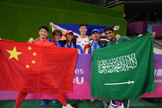 9月30日,菲律賓選手奧貝納(右三)、中國選手黃博凱(左一)和季軍沙特阿拉伯選手希扎姆(右一)在杭州亞運會田徑項目男子撐桿跳高決賽后合影。新華社記者 李一博 攝
