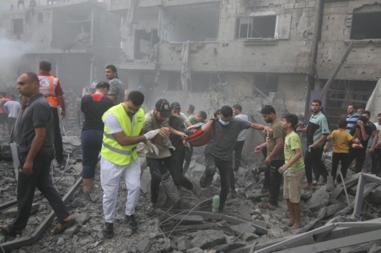 10月12日,在加沙地帶南部城市汗尤尼斯,人們?cè)谠庖陨锌找u后的建筑廢墟中抬出遇難者遺體。新華社發(fā)(亞西爾·庫(kù)迪攝)
