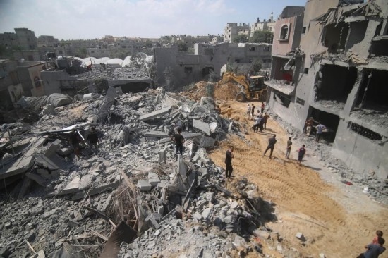 10月12日,在加沙地帶南部城市拉法,人們?cè)谠庖陨锌找u的受損建筑中救援傷者。新華社發(fā)(哈立德·奧馬爾攝)