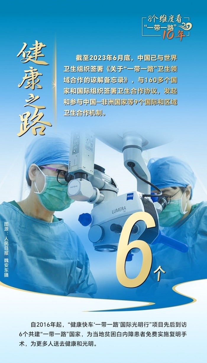 截至2023年6月底,中國已與世界衛(wèi)生組織簽署《關(guān)于“一帶一路”衛(wèi)生領(lǐng)域合作的諒解備忘錄》,與160多個國家和國際組織簽署衛(wèi)生合作協(xié)議,發(fā)起和參與中國—非洲國家、中國—阿拉伯國家、中國—東盟衛(wèi)生合作等9個國際和區(qū)域衛(wèi)生合作機(jī)制。為共建國家培養(yǎng)數(shù)萬名衛(wèi)生管理、公共衛(wèi)生、醫(yī)學(xué)科研等專業(yè)人才,向58個國家派出中國醫(yī)療隊,赴30多個國家開展“光明行”,免費(fèi)治療白內(nèi)障患者近萬名,與湄公河流域國家、中亞國家、蒙古國等周邊國家開展跨境醫(yī)療合作,衛(wèi)生健康合作成效顯著。
