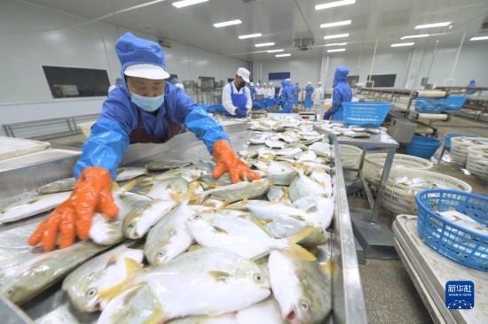 10月17日,位于中印尼“兩國雙園”的福建淼天匯食品有限公司員工在挑選準(zhǔn)備出口到印尼的魚產(chǎn)品。