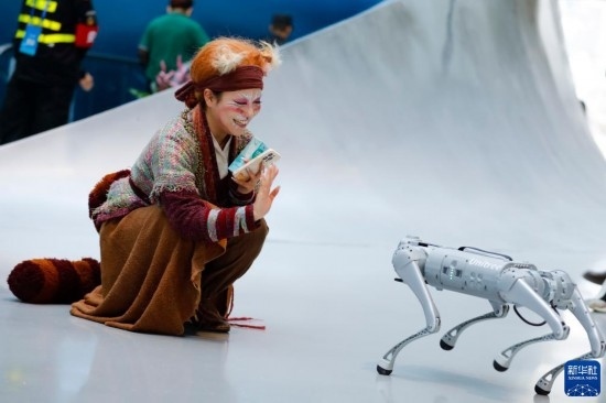 10月18日,在第81屆世界科幻大會主場館——成都科幻館內(nèi),一名演員與機(jī)器狗互動。