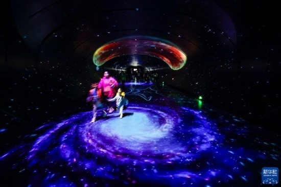 10月18日,在第81屆世界科幻大會主場館——成都科幻館內(nèi),人們走在“時(shí)空隧道”內(nèi)。