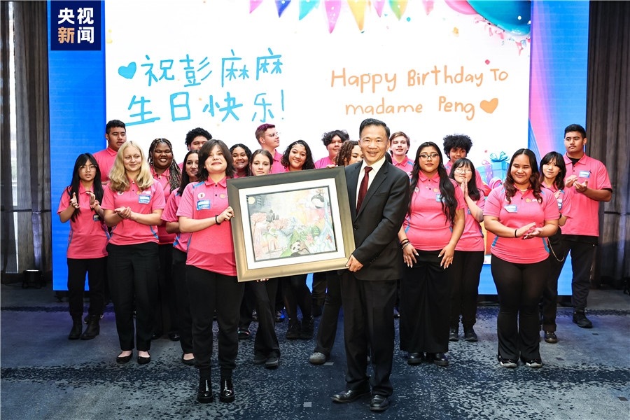 活動(dòng)現(xiàn)場,來自華盛頓州林肯中學(xué)的合唱團(tuán)演唱了中文歌曲《在希望的田野上》和英文歌曲《伴我同行》,祝愿中美友誼的紐帶更加牢固,煥發(fā)新的活力。同學(xué)們還為習(xí)近平主席和夫人彭麗媛精心準(zhǔn)備了手繪畫作《一起向未來》,并用精美的生日賀卡和《生日快樂》歌親切地為“彭麻麻”送上了生日祝福??偱_(tái)臺(tái)長代為接收。