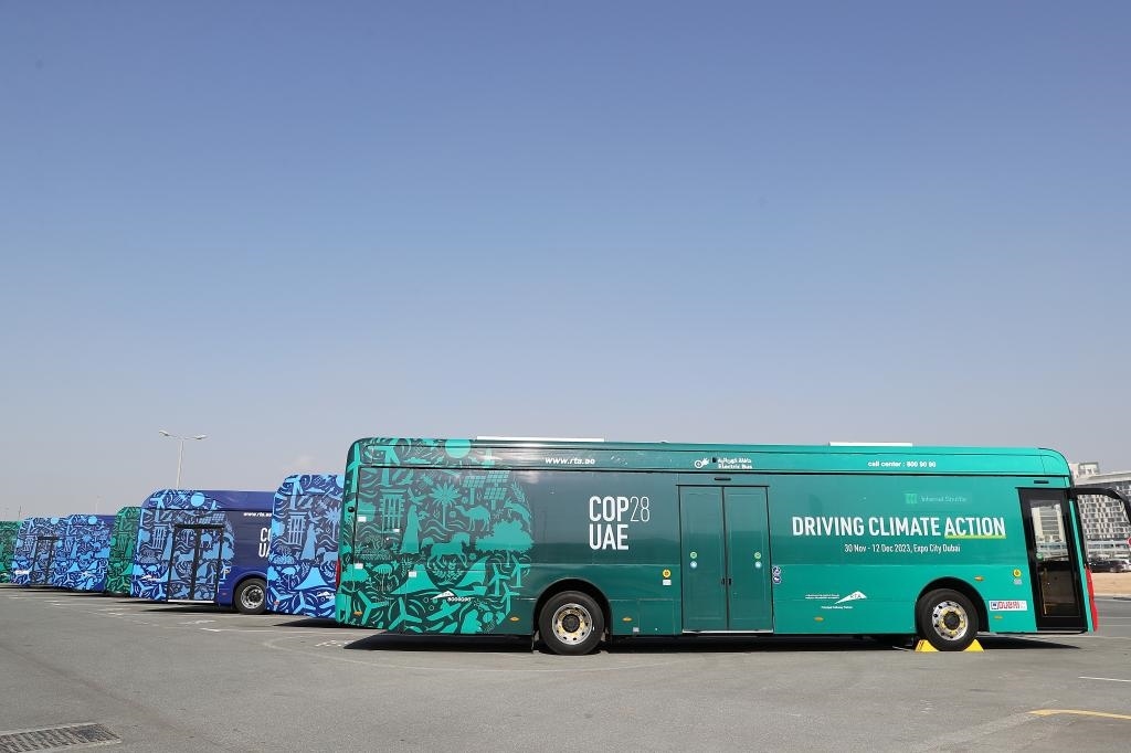 2023年12月3日,中國蘇州金龍公司的海格電動巴士(前)??吭诼?lián)合國氣候變化迪拜大會的擺渡車停車場。新華社記者 王東震 攝