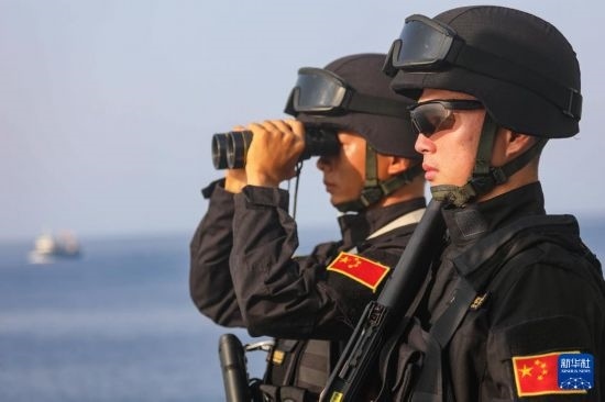 中國海軍第40批護(hù)航編隊(duì)岳陽艦特戰(zhàn)隊(duì)員在護(hù)航途中觀察警戒(2022年4月2日攝)。新華社發(fā)(唐文攝)