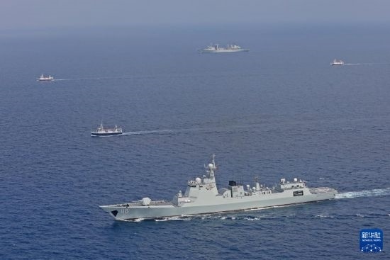 中國海軍第45批護(hù)航編隊(duì)烏魯木齊艦、東平湖艦為中國漁船護(hù)航(2023年10月20日攝)。新華社發(fā)(王遠(yuǎn)方攝)