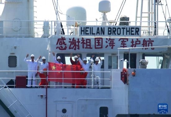 被護(hù)船舶懸掛起“感謝祖國海軍護(hù)航”的橫幅,向中國海軍第42批護(hù)航編隊(duì)揮手致意(2022年11月5日攝)。新華社發(fā)(馬玉彬攝)