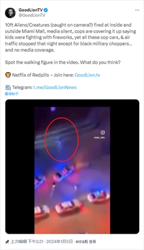 報道提到,一個推廣涵蓋科幻、陰謀論等內(nèi)容電影和紀(jì)錄片的X平臺賬號曬出現(xiàn)場視頻稱,“10英尺高的外星人/生物(被攝像機(jī)拍到?)朝邁阿密購物中心內(nèi)外開火,媒體沉默,警察掩蓋說孩子們?nèi)挤艧熁ú⒋蚨?,然而除了黑色軍用直升機(jī),所有警車和空中交通都在那天晚上一動不動……這卻沒有媒體報道。視頻中出現(xiàn)了行走的身影。你覺得呢?”↓