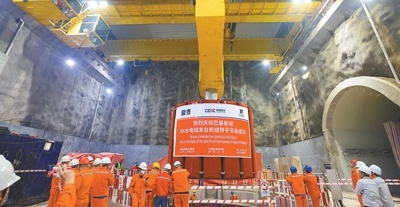 2023年6月10日,工人在巴基斯坦蘇吉吉納里水電站吊裝最后一臺機(jī)組轉(zhuǎn)子。中國能建葛洲壩海投公司供圖