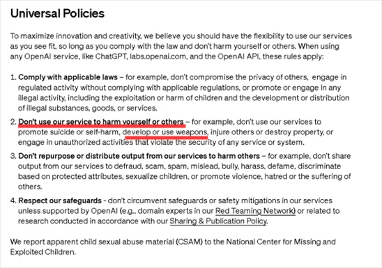 然而,在1月10日對其使用條款進行一番大更新后,OpenAI公司雖然在禁止項中仍然提到禁止將其產(chǎn)品、模型和服務(wù)用于會導(dǎo)致人員傷亡的用途上,并提到了“武器開發(fā)和使用”,但先前同樣被禁止的軍事用途,如今卻在文本中消失了。